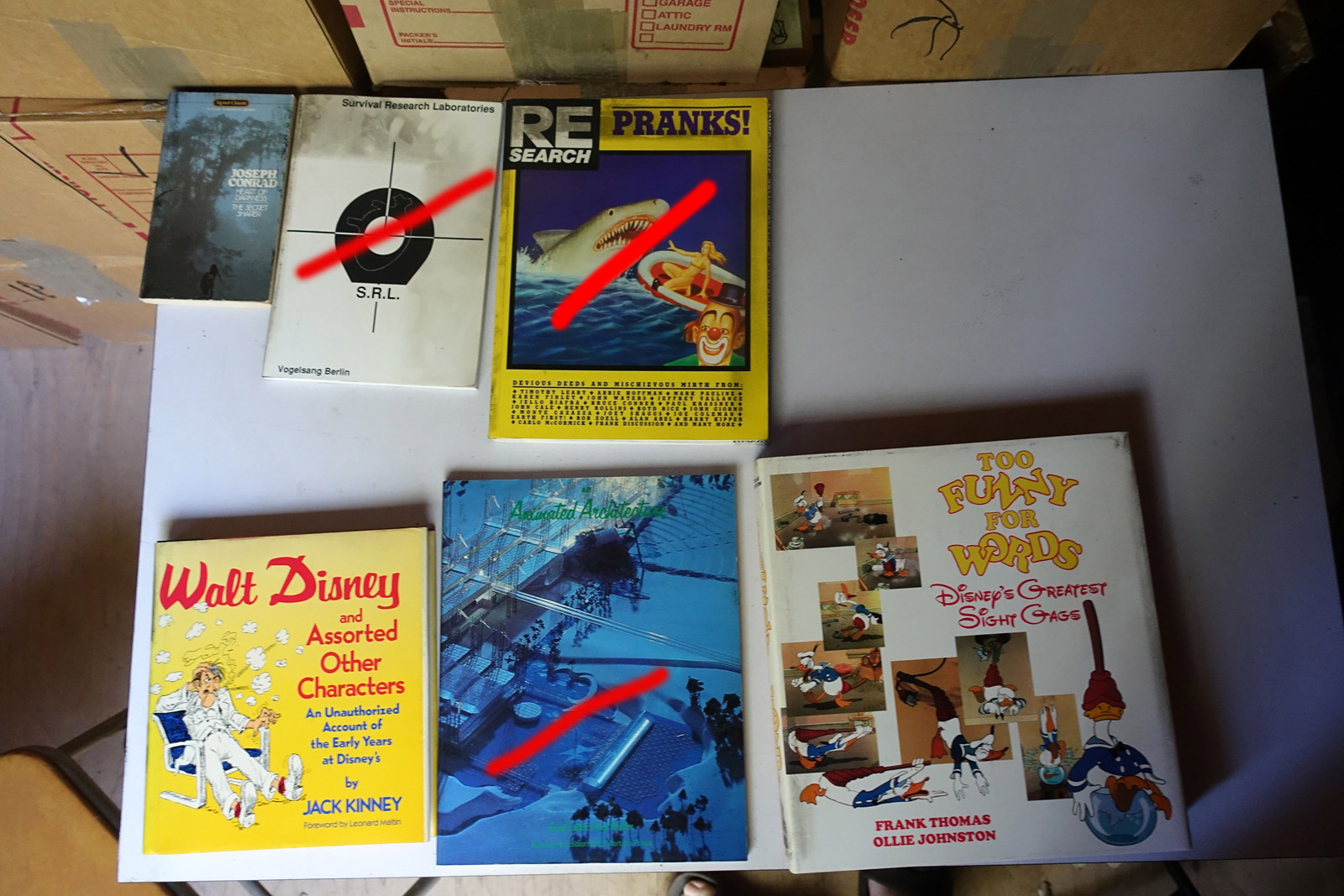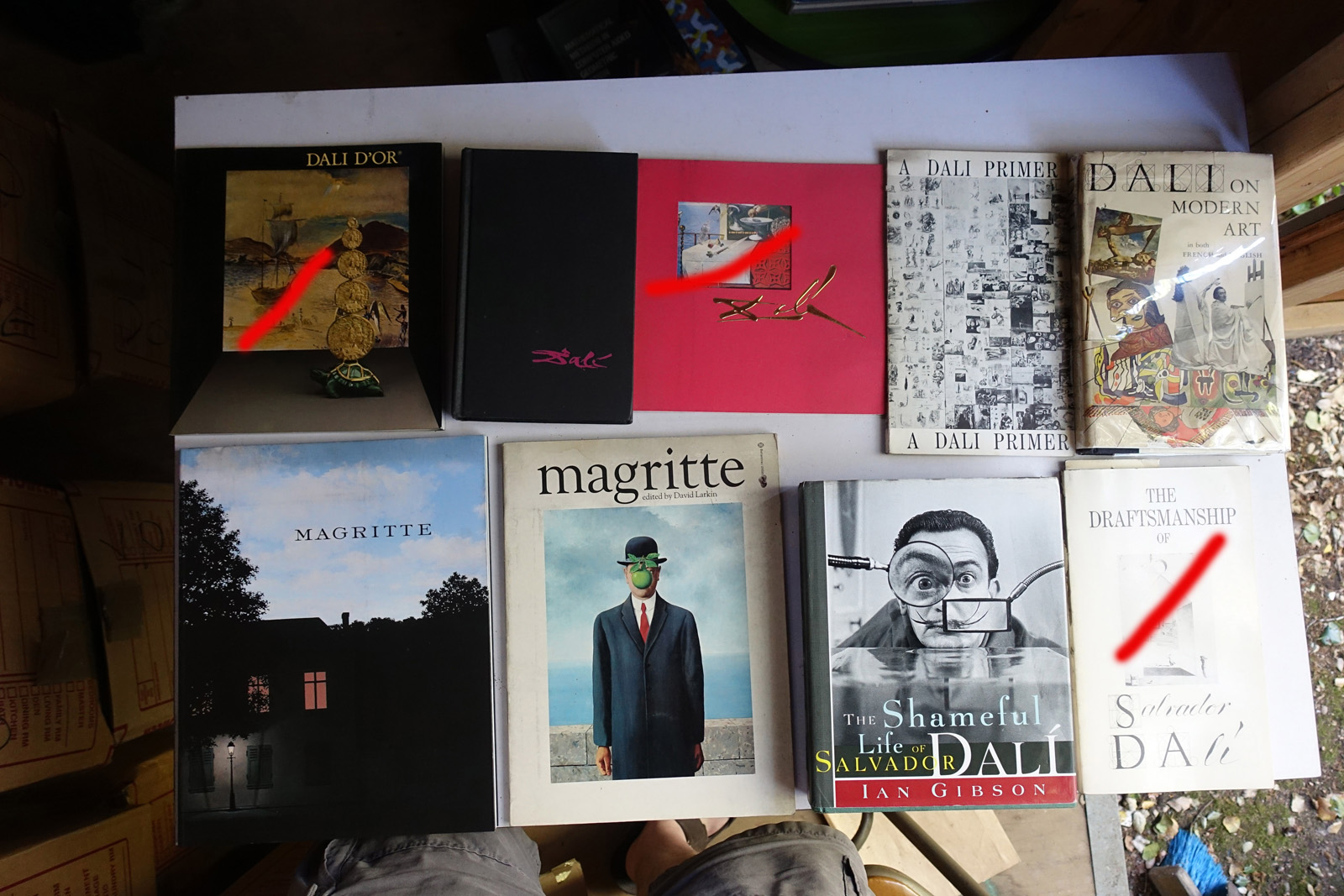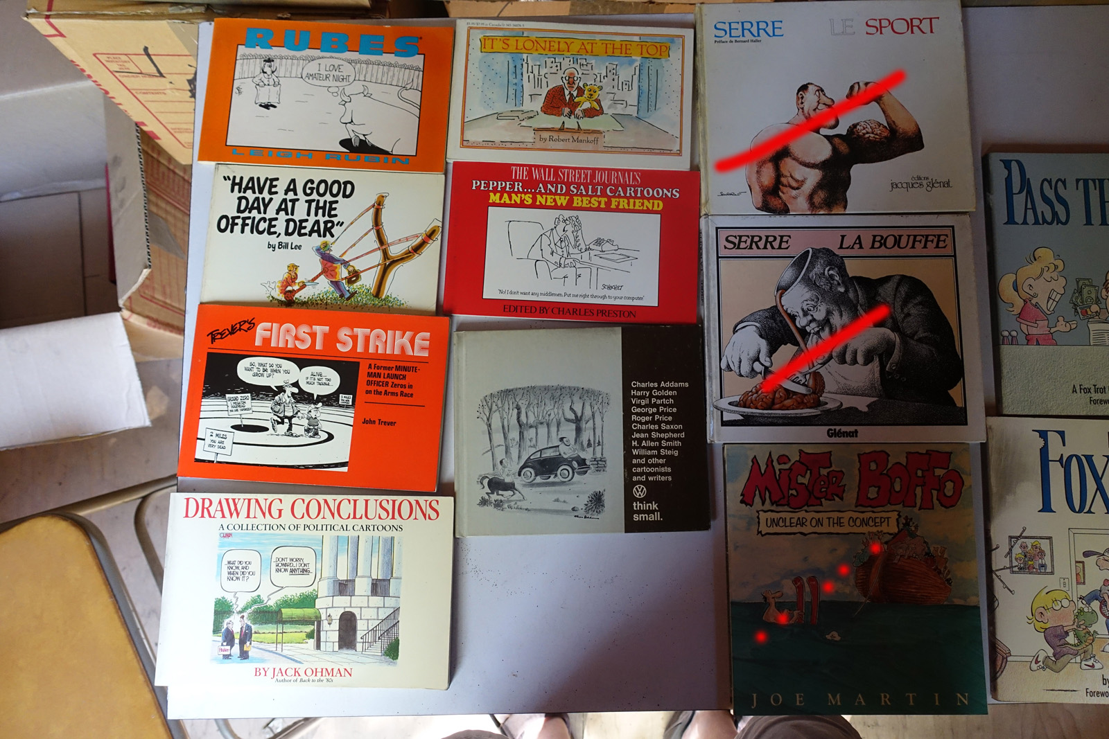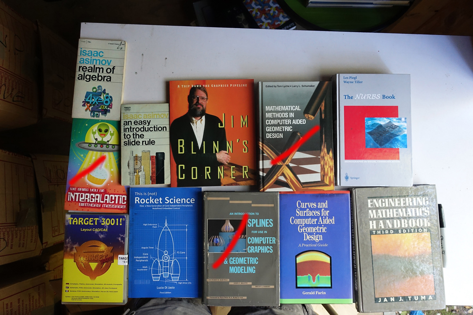 Books with red marks painted on the photo indicate volumes I've pulled aside, either for sentimental reasons or because I'm concerned I can't replace them. These are not available. This marking isn't 100% accurate, it's from memory after I took all the photos; so a few unmarked books may also be pulled aside.