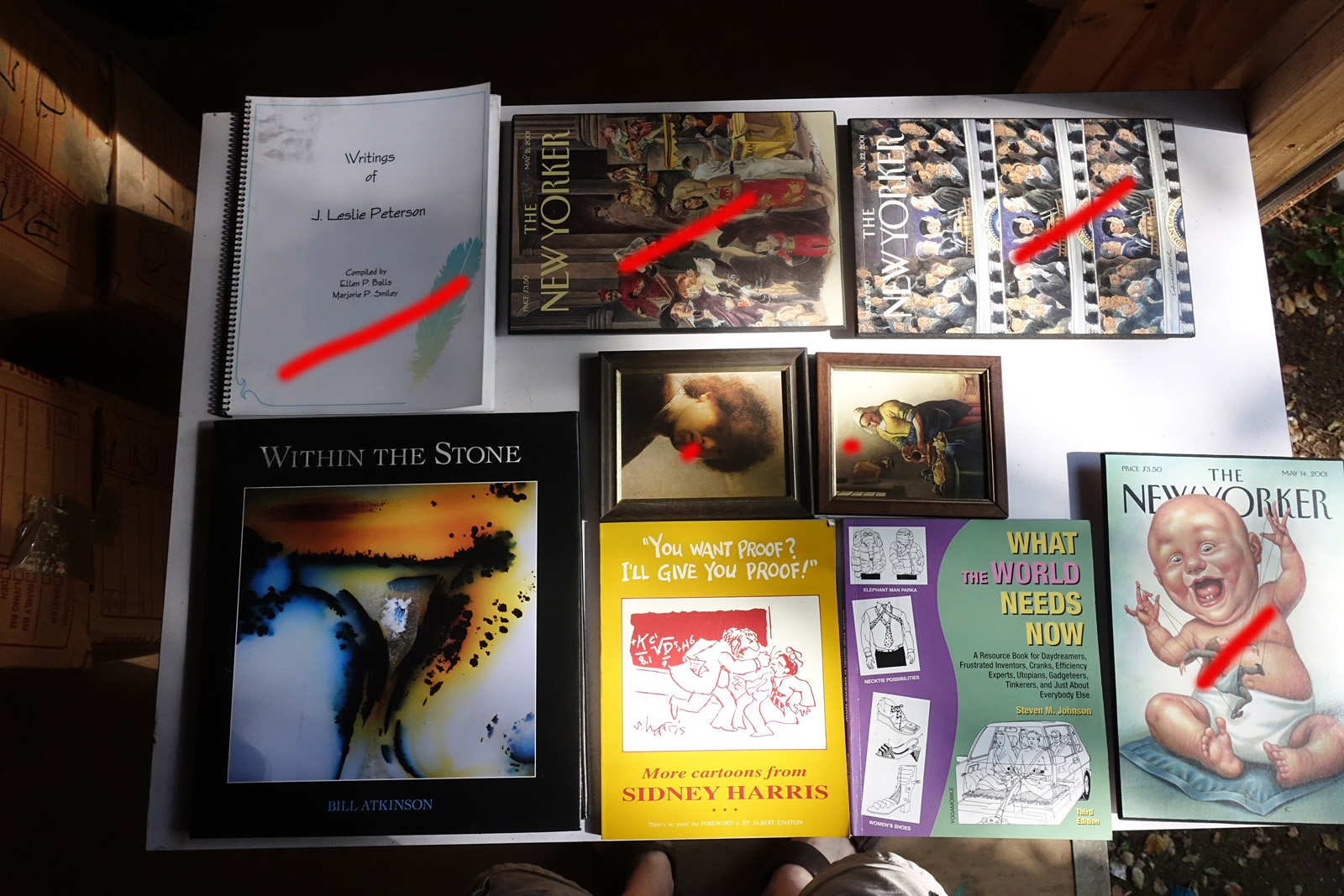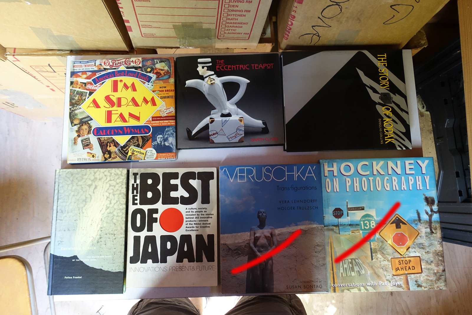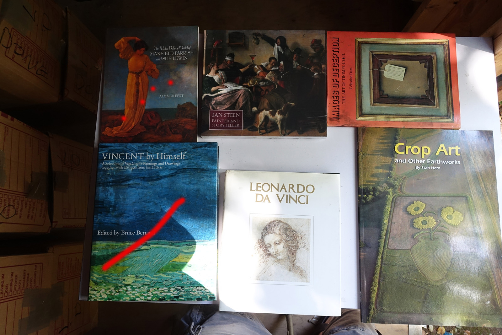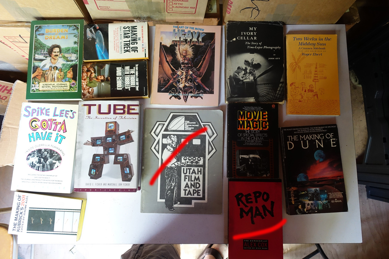 Books with red marks painted on the photo indicate volumes I've pulled aside, either for sentimental reasons or because I'm concerned I can't replace them. These are not available. This marking isn't 100% accurate, it's from memory after I took all the photos; so a few unmarked books may also be pulled aside.