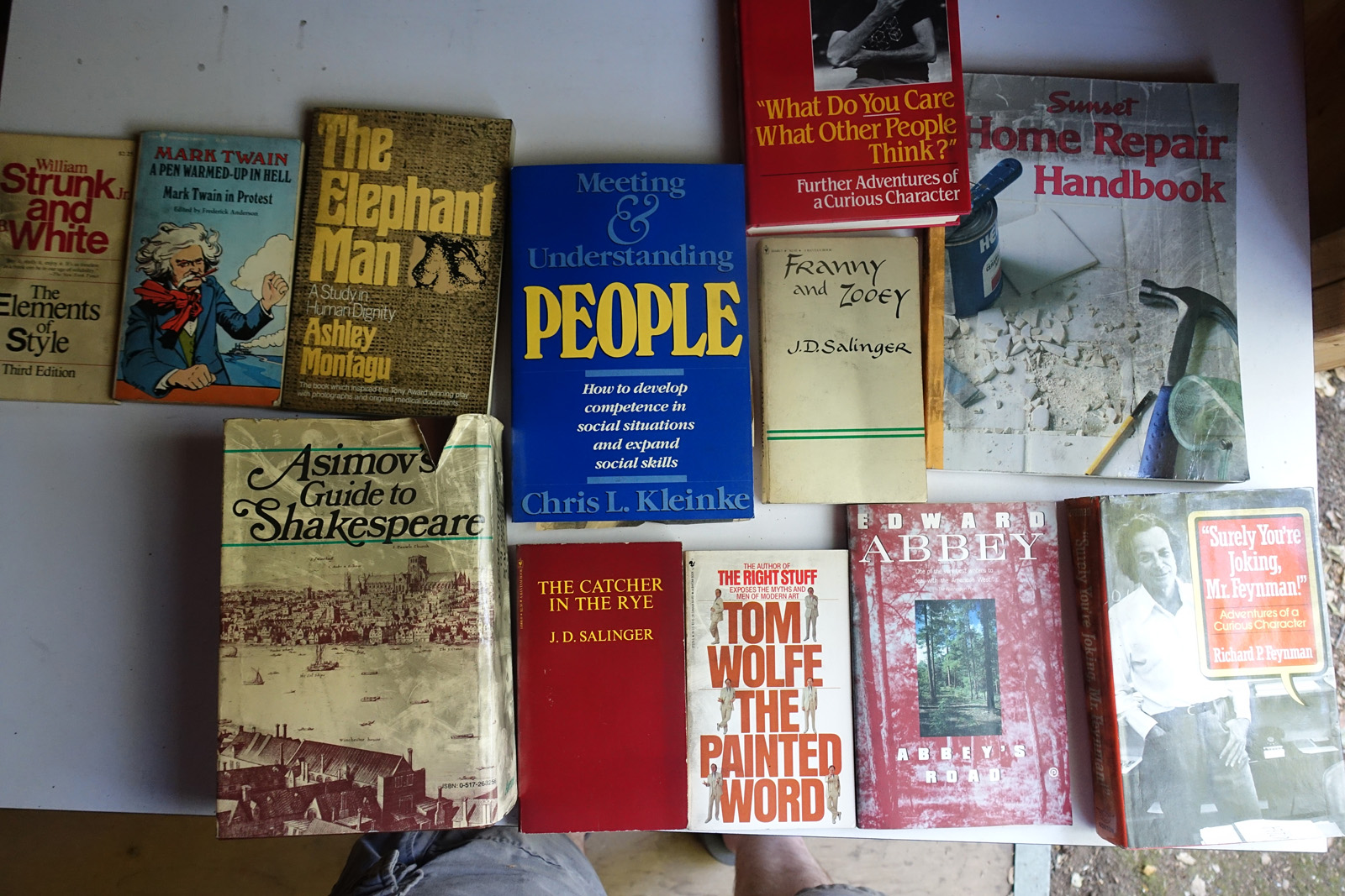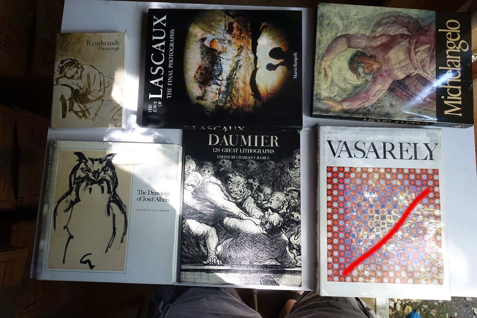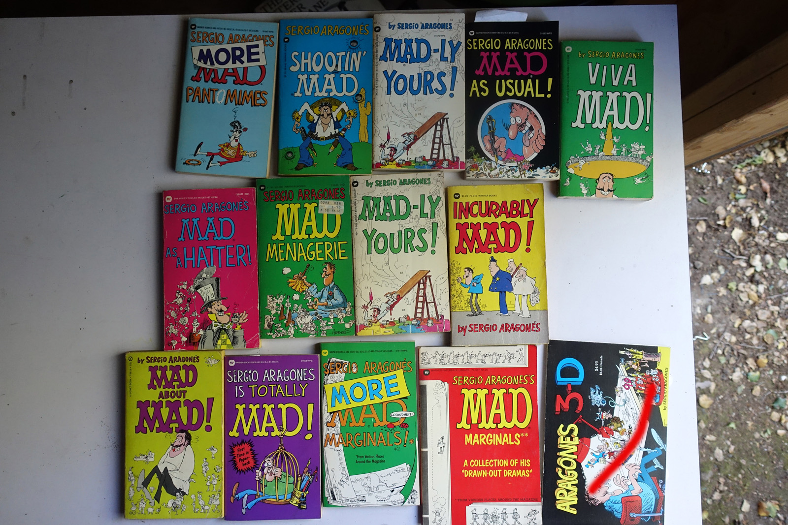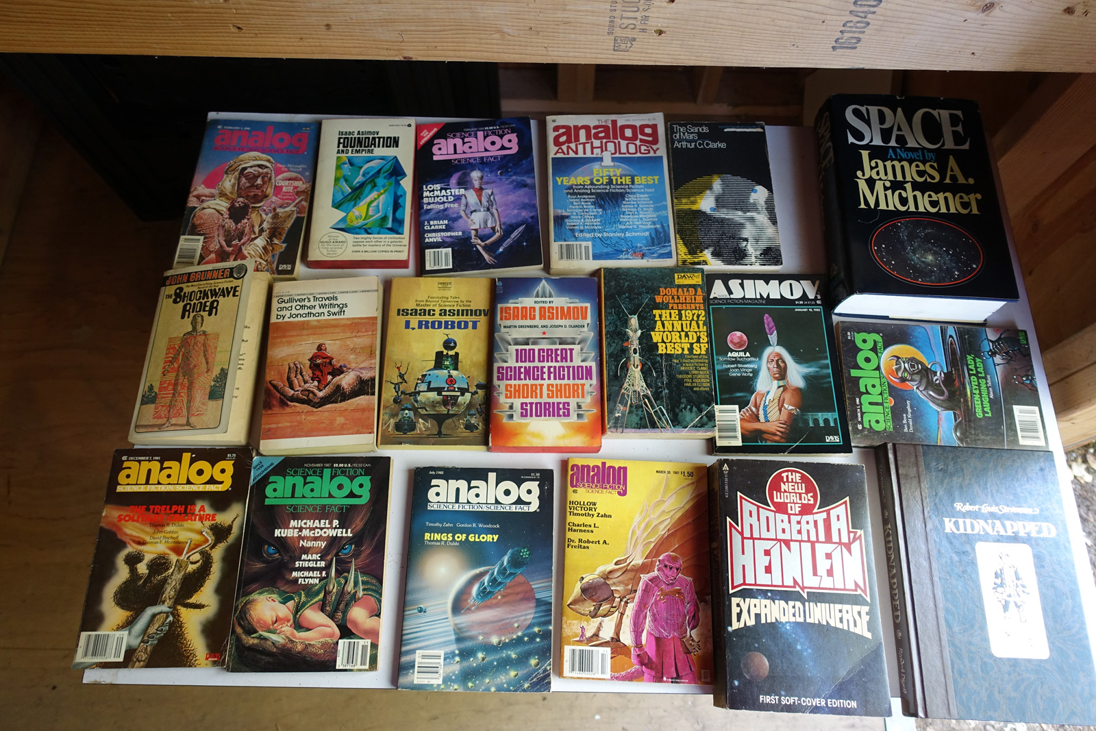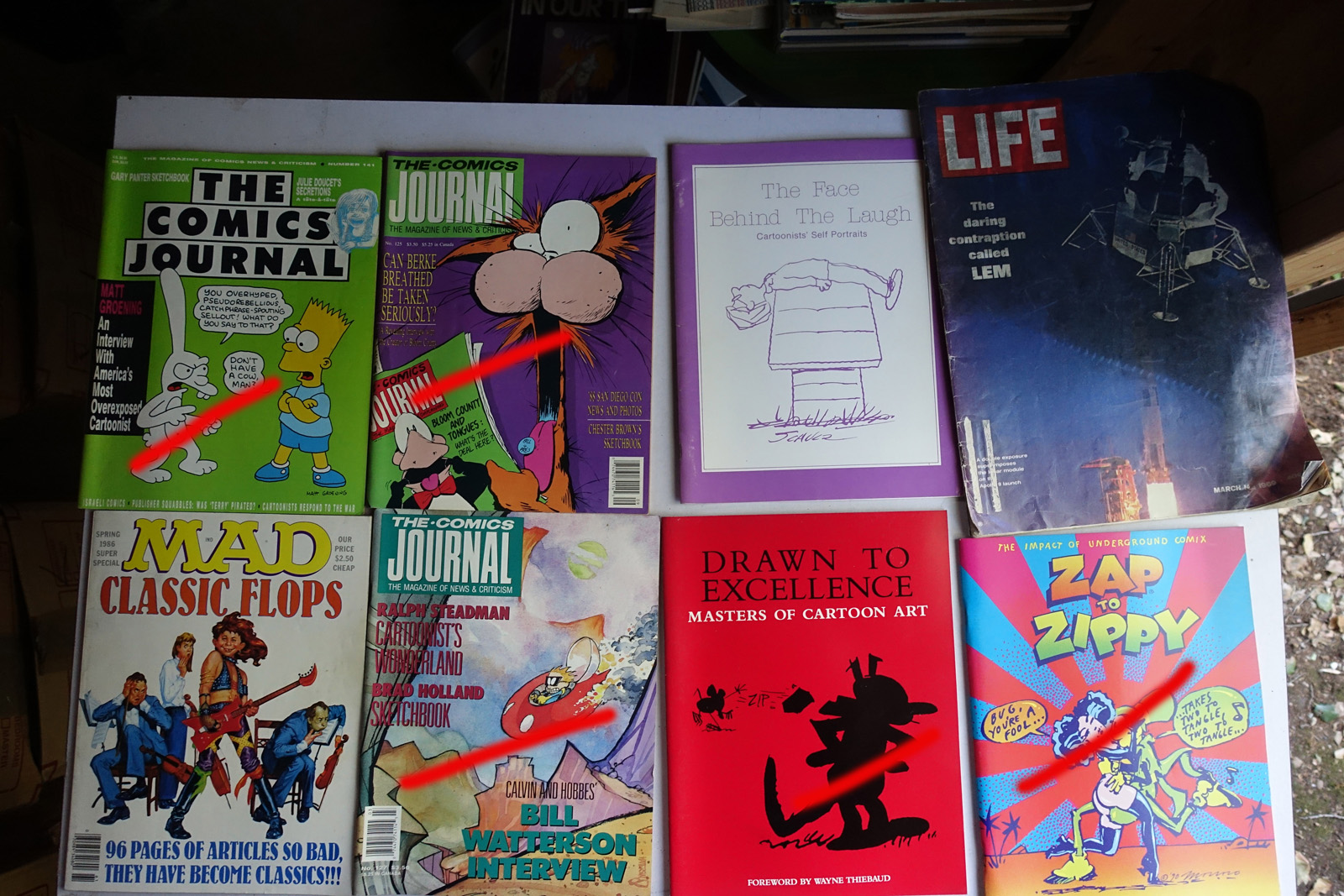 Books with red marks painted on the photo indicate volumes I've pulled aside, either for sentimental reasons or because I'm concerned I can't replace them. These are not available. This marking isn't 100% accurate, it's from memory after I took all the photos; so a few unmarked books may also be pulled aside.
