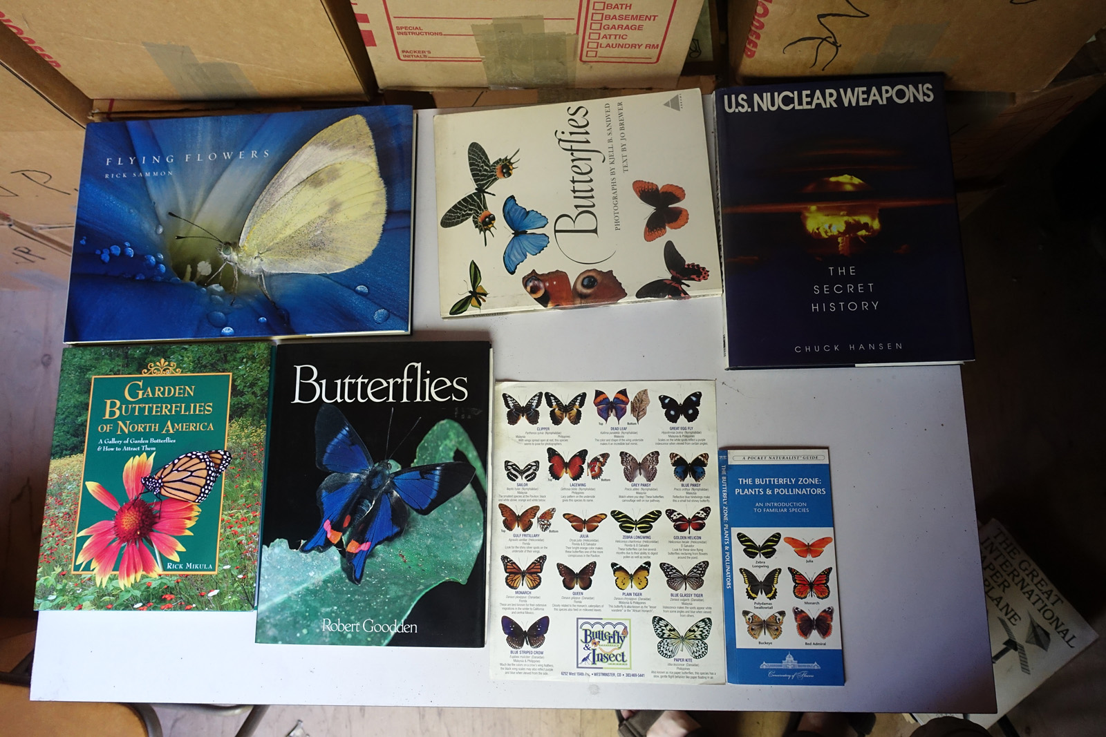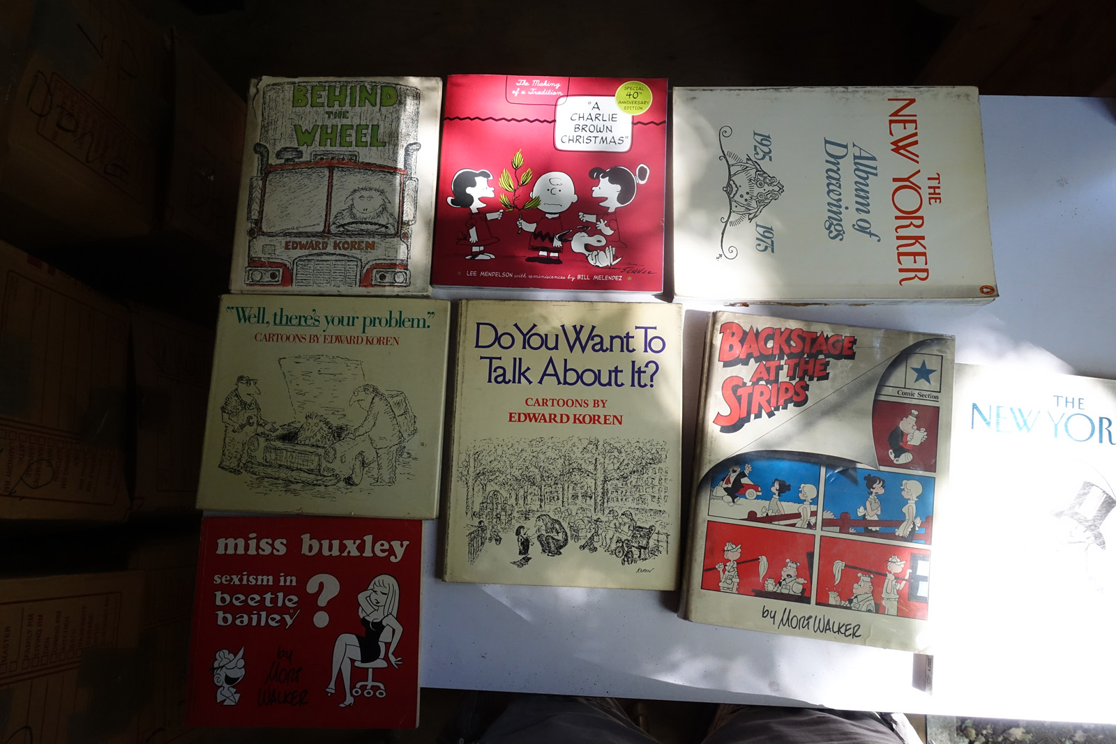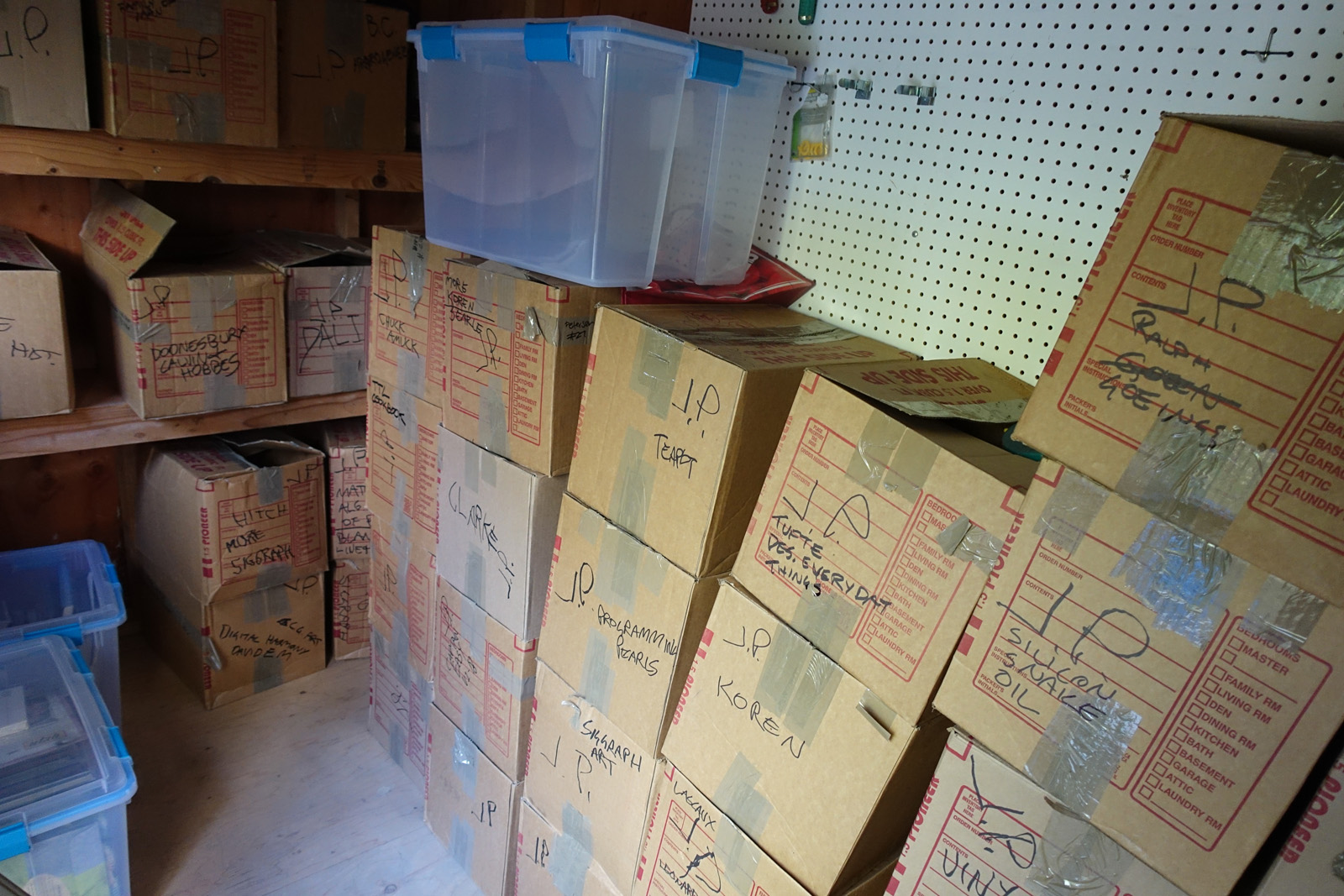 This is included to give some idea as to the current storage situation. The books are in approximately 40 boxes. The shed is well made, but it is about 20+ years old. The titles on the boxes name one or two books inside, so I can link it to the photos.