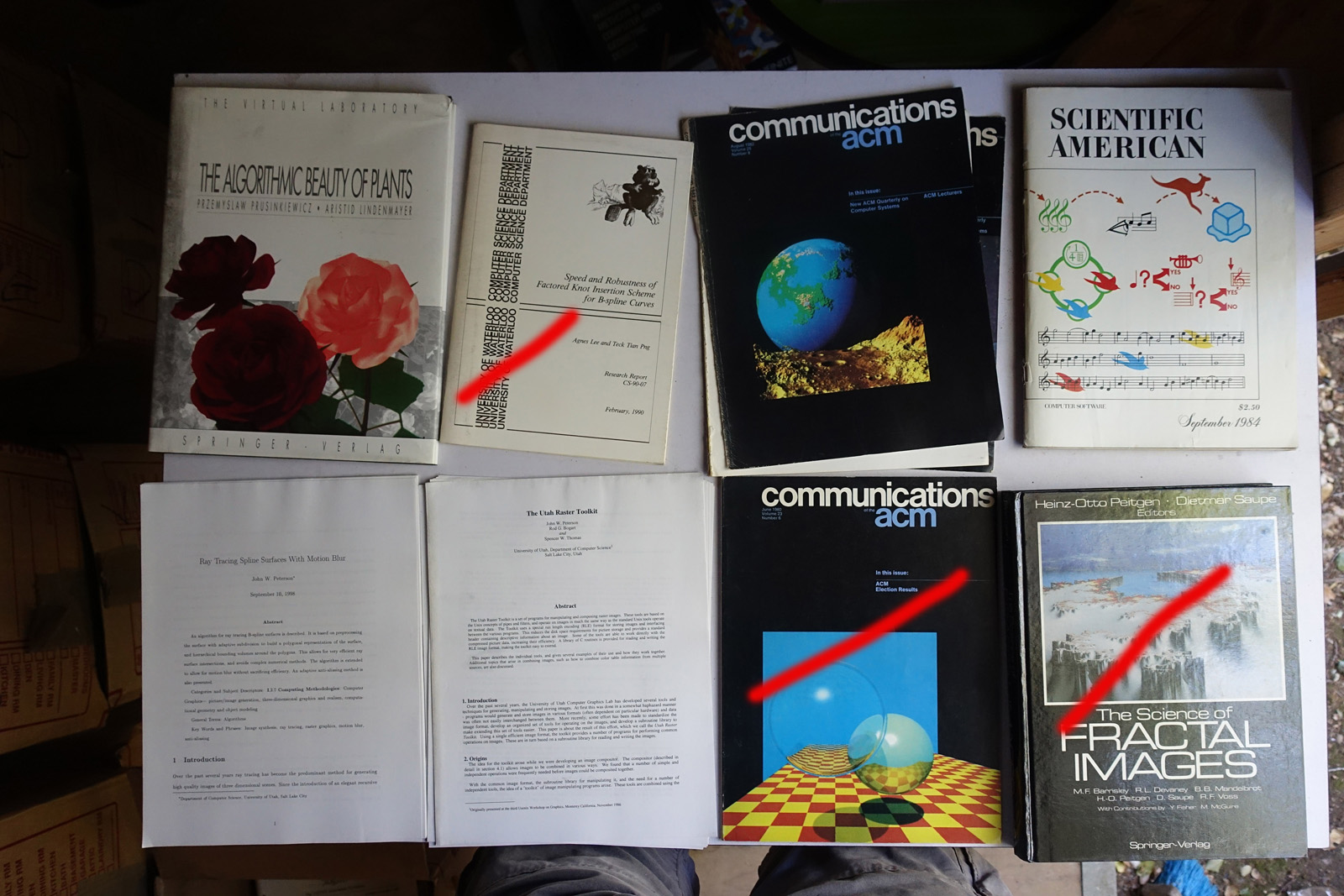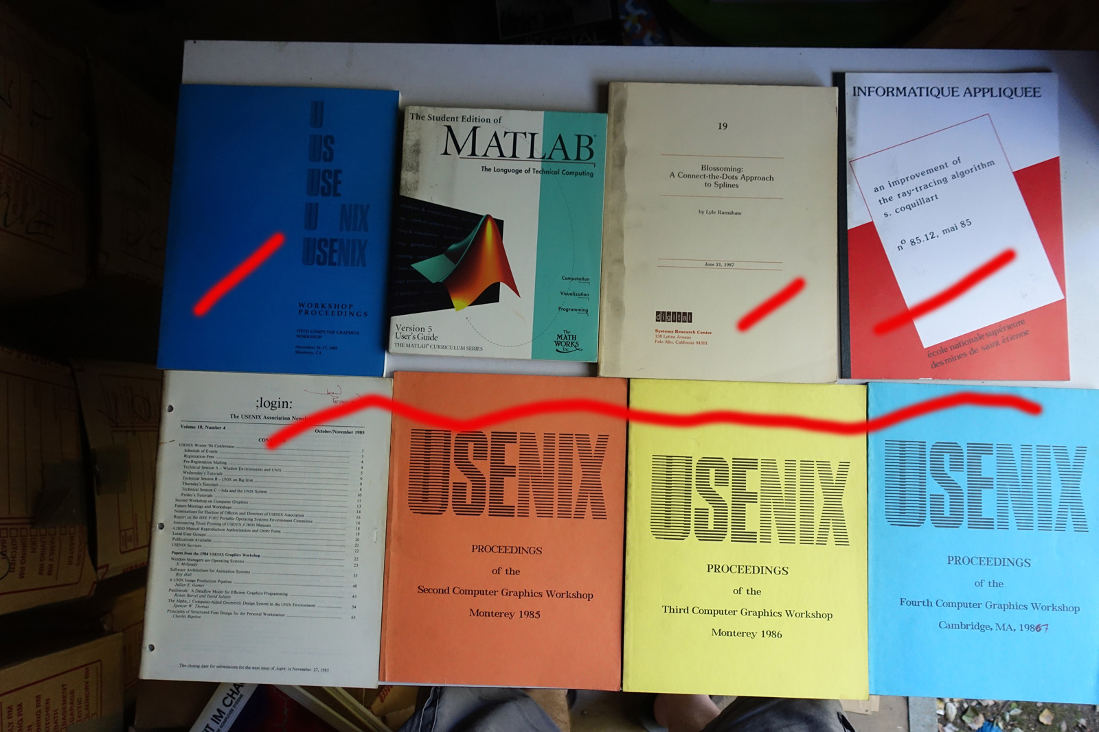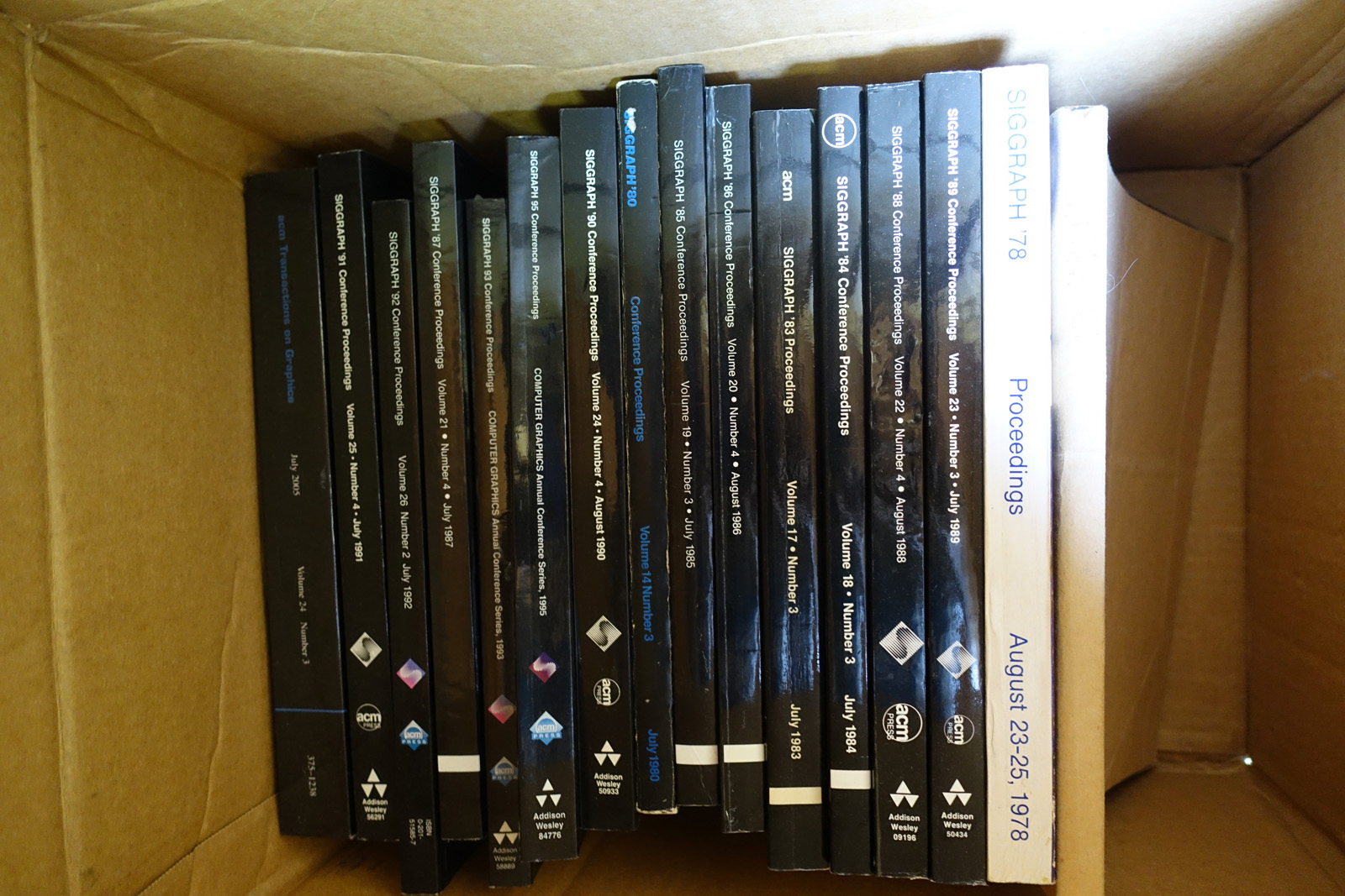 The books are stored in a shed. They're reasonably safe there, but the shed is ~20 years old and I can't guarentee it's 100% water tight. The shed may need to come down this fall depending on construction on the house. Contact me via @isonno on Twitter, or jp[at]acm.org if you're interested.